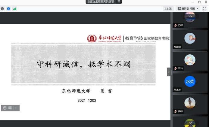 之后,开展“守科研诚信,抵学术不端”的学术报告,主讲人是东北师范大学教育学部教育管理学院博士生导师夏雪老师,成人直播平台