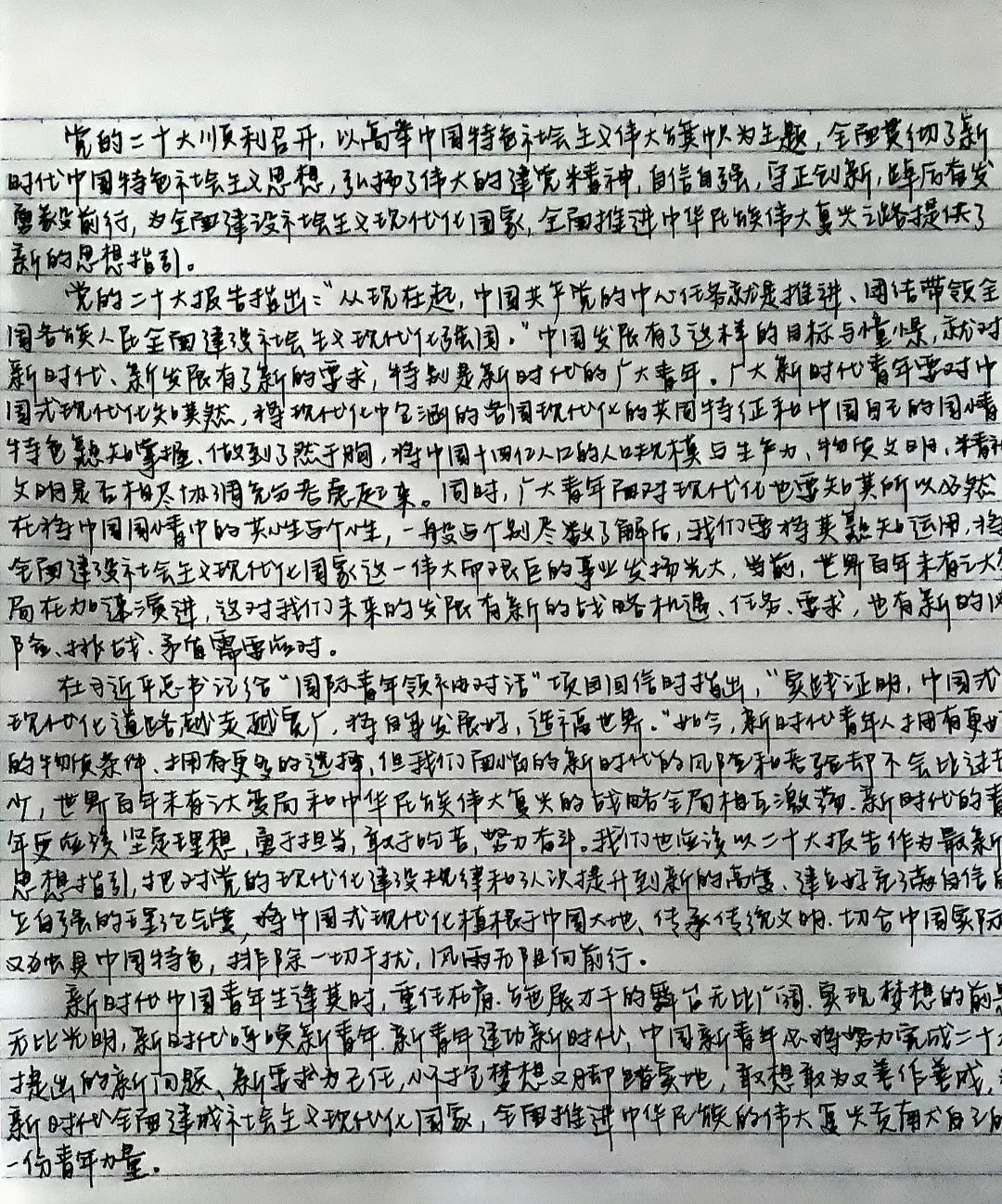 习近平总书记在党的二十大报告中指出:“广大青年要坚定不移听党话、跟党走,怀抱梦想又脚踏实地,敢想敢为又善作善成,立志做有理想、敢担当、能吃苦、肯奋斗的新时代好青年,让青春在全面建设社会主义现代化国家的火热实践中绽放绚丽之花。”青年要坚持用党的科学理论武装自我,脚踏实地、奋发学习,为新时代新征程贡献自己的青春力量。