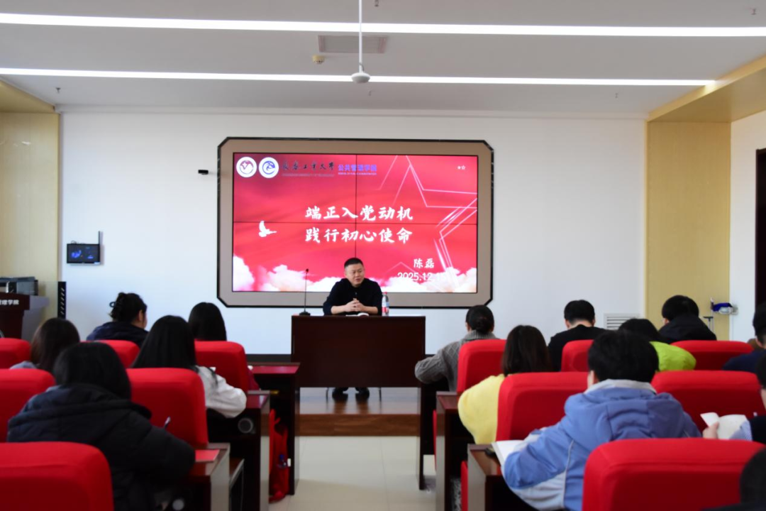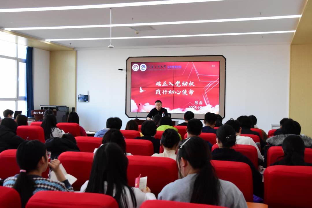 新闻网讯(通讯员 崔元慧)12月17日,学院党委副书记陈磊老师以“端正入党动机,践行初心使命”为主题,在主楼301报告厅为学院入党积极分子培训班学员讲授专题党课。此次党课旨在深入学习贯彻习近平新时代中国特色社会主义思想,引导青年学生牢固树立党章意识,从党的根本大法中汲取精神力量,筑牢信仰之基、补足精神之钙、把稳思想之舵。