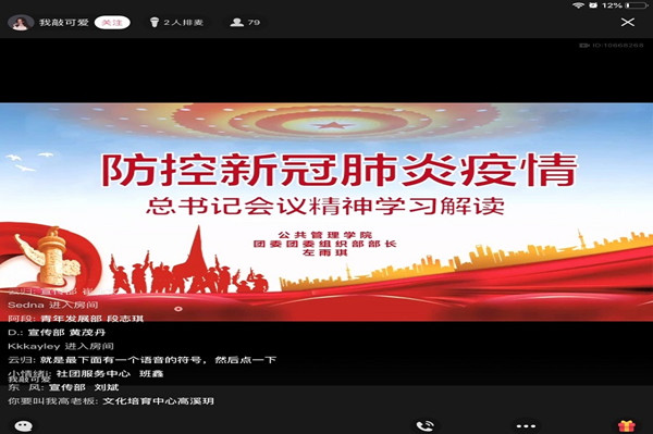学习内容主要分为三个部分。首先由左雨琪同学带领大家学习习总书记重要讲话。在疫情期间,习近平总书记始终高度重视,多次召开会议、多次听取汇报、做出重要指示,始终要求各级要把人民群众生命安全和身体健康放在第一位。习总书记强调,疫情就是命令,防控就是责任,各级要增强“四个意识”、坚定“四个自信”、做到“两个维护”。而后左雨琪同学通过分析疫情防控工作的部署,带领社团成员感受我国强大的制度优势。各部门多措并举,及时地建立完整的应对机制,出台并落实救治费用补助政策、制定疫情防控指南、统筹协调医疗机构、引导舆论正向发展。不仅为抗击疫情贡献着自己的力量,更为抗击疫情提供健全有序的制度支撑。最后,左雨琪同学针对“面对时代大任,我们应该怎样做”向大家提出了几点建议。提出在疫情期间,我们要积极配合家乡社区、街道、政府进行的防疫工作,尽自己所能发挥青年力量。作为大学生要树立信仰用信仰为青春定向,用知识为青春赋能,努力奋斗用奋斗为青春添彩。