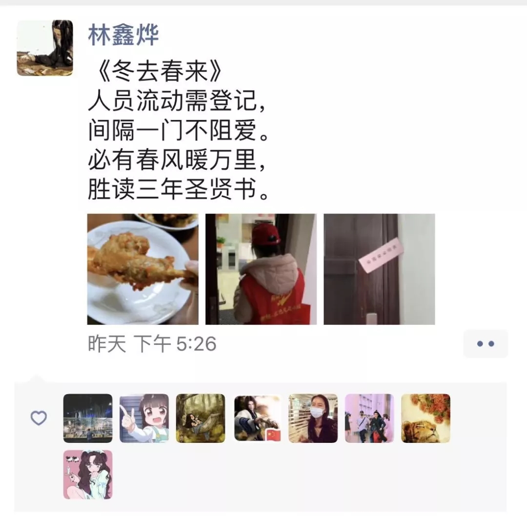 林鑫烨同学的才华也是非常出众的,平时生活的一点一滴都会被她用诗歌的方式记录下来。在她的朋友圈我们不仅能感受到她原创诗歌的优美,也总能被她那积极乐观的心态所感动。