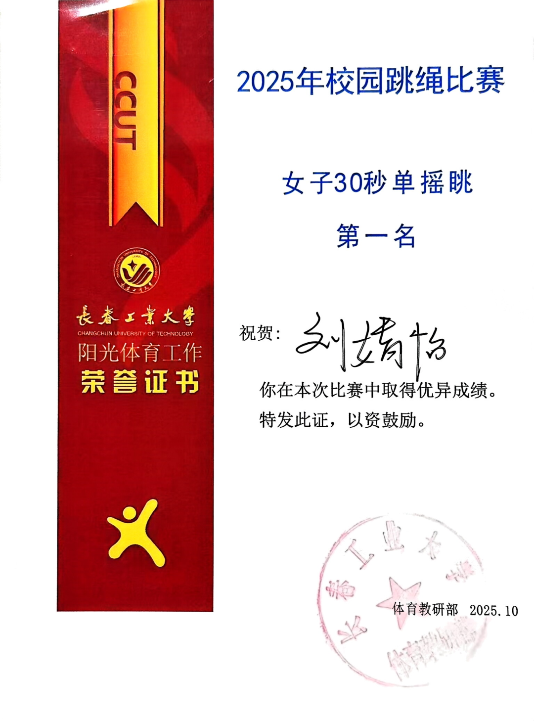 代表队以昂扬的斗志和出色的表现闪耀全场,最终荣获团体总分第二名的好成绩!其中,刘婧怡同学表现尤为亮眼,包揽女子30秒单摇跳、双摇跳第一名及女子30秒交叉单摇跳第二名。