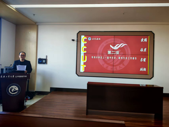 第八届研究生会主席团成员闫明结合服务同学、实践发展等方面总结上一届研究生会工作经验,并寄语新一届学生干部要坚守初心、务实笃行,不浮于表面,不急于求成,为学院发展贡献属于自己的力量。