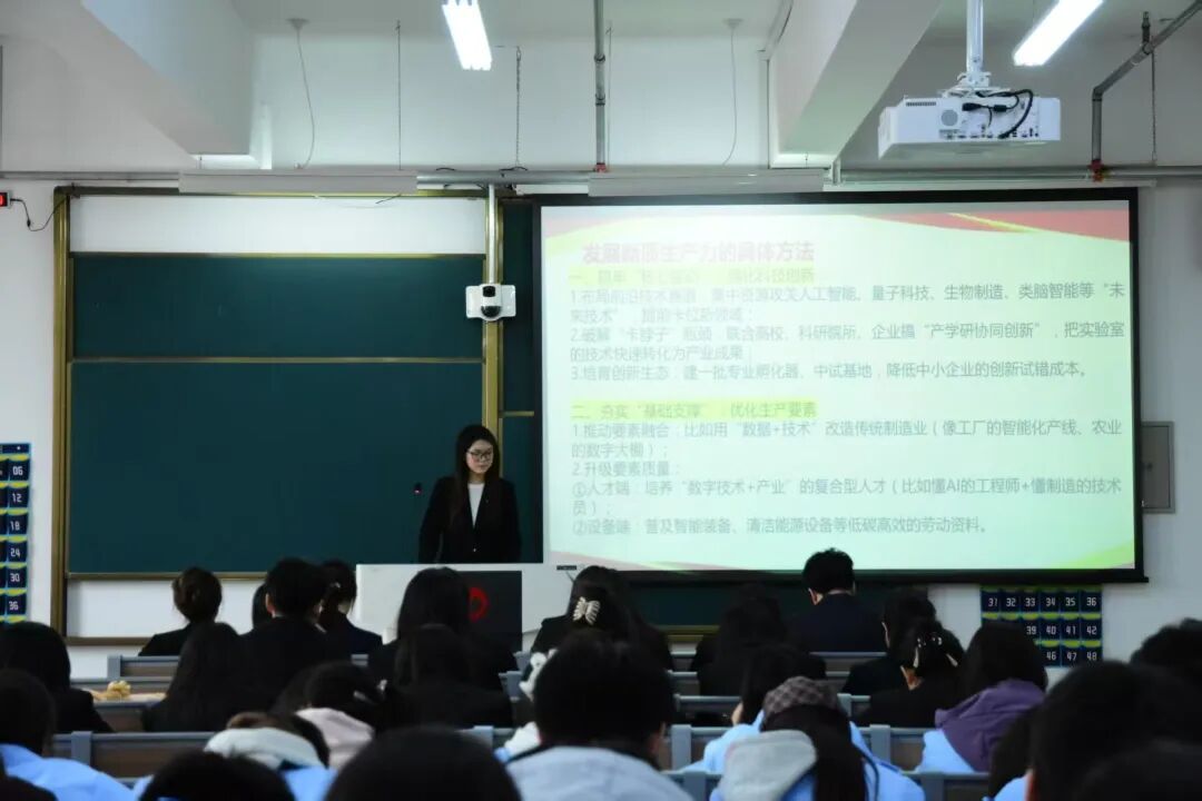 本次活动中,主讲人围绕“为何要学习新质生产力”、“什么是新质生产力”、“如何发展新质生产力”三大板块展开解读。从理论上清晰阐释新质生产力是以科技创新为核心驱动力,融合新要素、新业态的先进生产力形态。此外,主讲人从科创驱动、要素优化、产业重构、制度完善等方面进行了深入分析,指出破解技术“卡位”、提升要素配置效率、增强产业动能和优化制度环境,是推动新质生产力落地的关键路径,为同学们提供了具有实践价值的思路与启发。