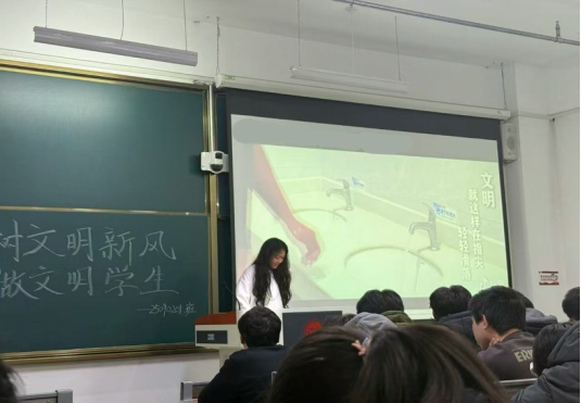 此次活动由团支书杨文琳同学主持。活动伊始,杨文琳同学以“新时代青年的修身之道”为切入点,通过PPT展示、案例分享等形式,解读了“修身律己”的时代内涵——从校园里的文明用语、垃圾分类,到社会中的志愿服务、公共秩序维护,让同学们明白“文明”并非抽象概念,而是融入日常的点滴行动。同学们也明白了部分不文明现象的改进方向,在思想碰撞中凝聚起“以文明为荣、以陋习为耻”的共识。