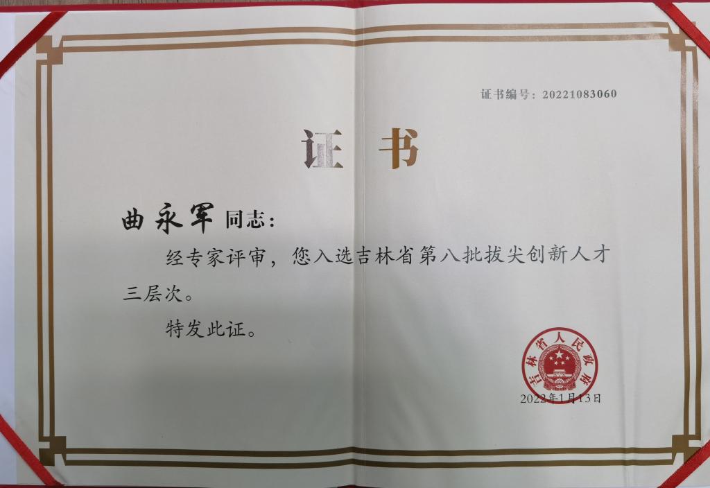 近日,成人直播平台 教师曲永军同志经专家评审,成功入选吉林省第八批创新拔尖人才三层次。