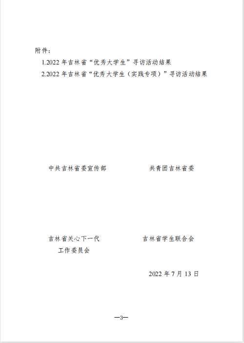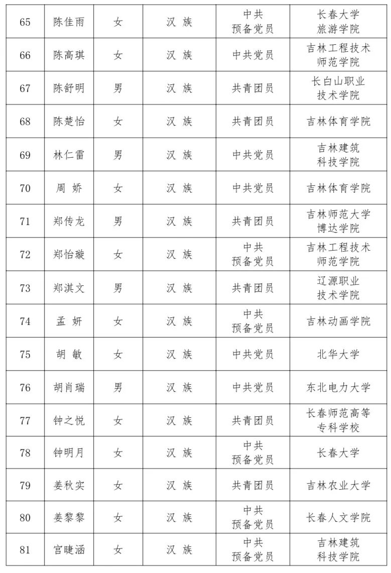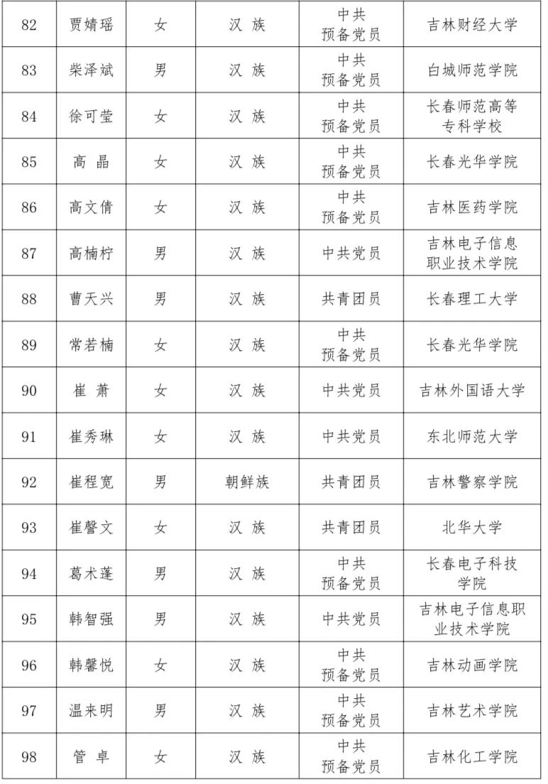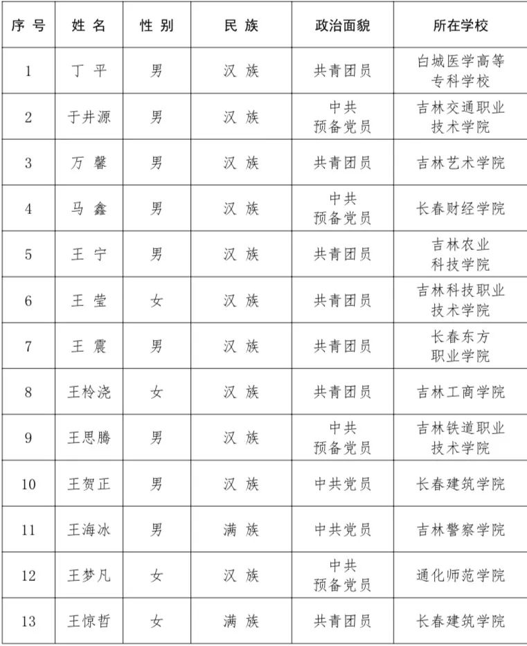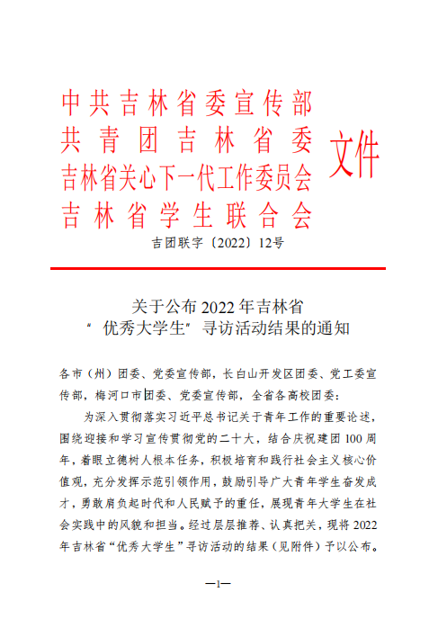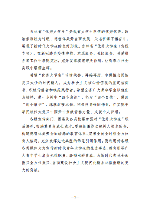 吉林省“优秀大学生”是我省大学生队伍的优秀代表,政治素质较为过硬、德智体美劳全面发展,矢志拼搏不懈奋斗,展现了新时代大学生的良好形象。吉林省“优秀大学生(实践专项),在新冠肺炎疫情防控、志愿服务、社区服务、关爱服务等工作中表现突出,充分发挥模范带头作用,让青春在社会实践中熠熠生辉。