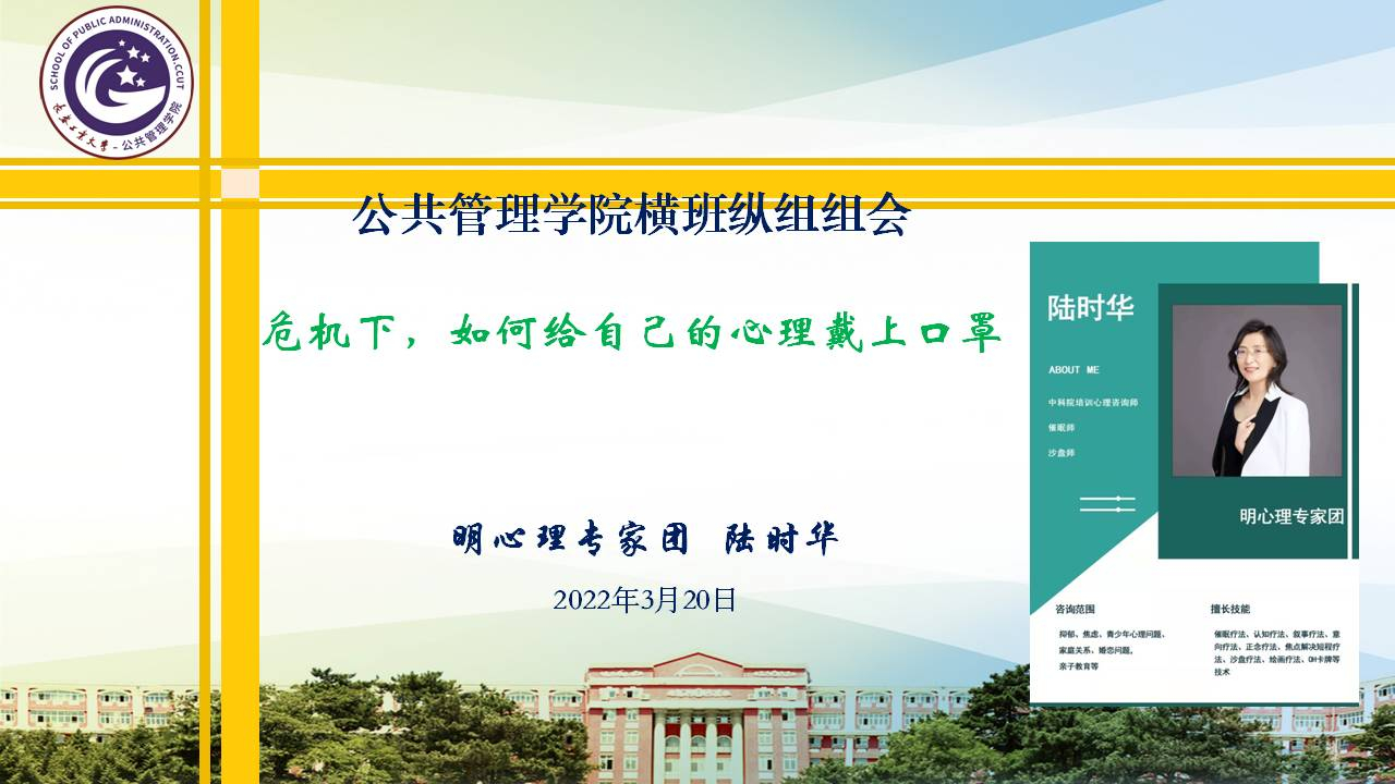 公共管理系韩小威、姜雨峰两位老师召开“横班纵组”组会,邀请明心理专家团讲师陆时华为同学们作了《危机下,如何给自己的心理戴上“口罩”》的心理讲座。