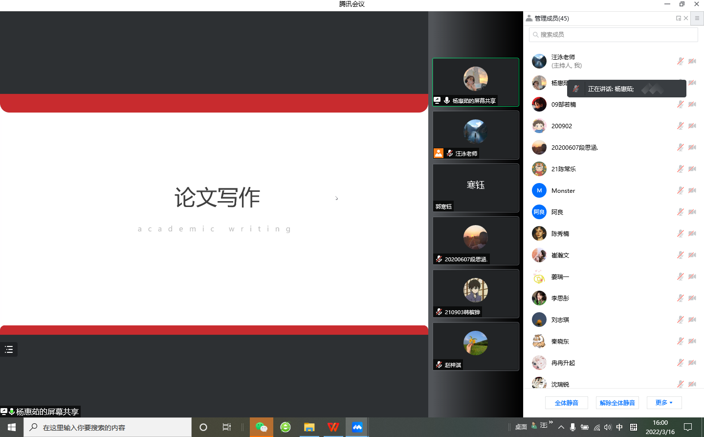开学第四周,公共管理系的汪泳老师组织200902班全体同学以及横班纵组导师组学生,召开了主题班导师会《大四毕业论文阶段的经验分享》。在分享会上,研究生向本科生介绍了毕业论文的写作经验,汪泳老师以疫情防控大局为重点,以学业学习为中心,围绕加强自我管理、自我监督,在疫情防控大考中,实现从他律向自律的人生转变等问题,与参会学生交流。