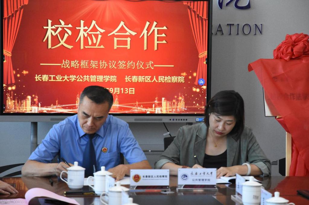 韩小威院长、长春新区人民检察院政治部张益群主任代表双方签署了战略框架合作协议。根据协议,校检双方将共同探索人才培养新模式,找准人才培养和行业需求的结合点,深化高等法学教育教学改革,强化法学实践教育,完善协同育人机制,构建法治人才培养共同体,培养德法兼修的一流法学人才。双方将在党建、学术交流、科研项目、实习实训等多方面展开合作。
