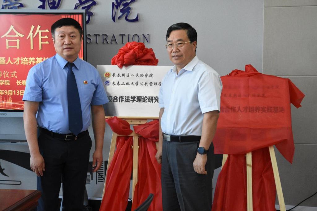 党委副书记李廷吉、长春新区人民检察院检察长高跃军共同为“检校合作法学理论研究基地”“校检合作人才培养实践基地”揭牌。校检双方将携手开展理论研究和实践探索,共建现代化司法理念教育平台,共享法学院校理论研究资源,共创法治人才培养的新局面。