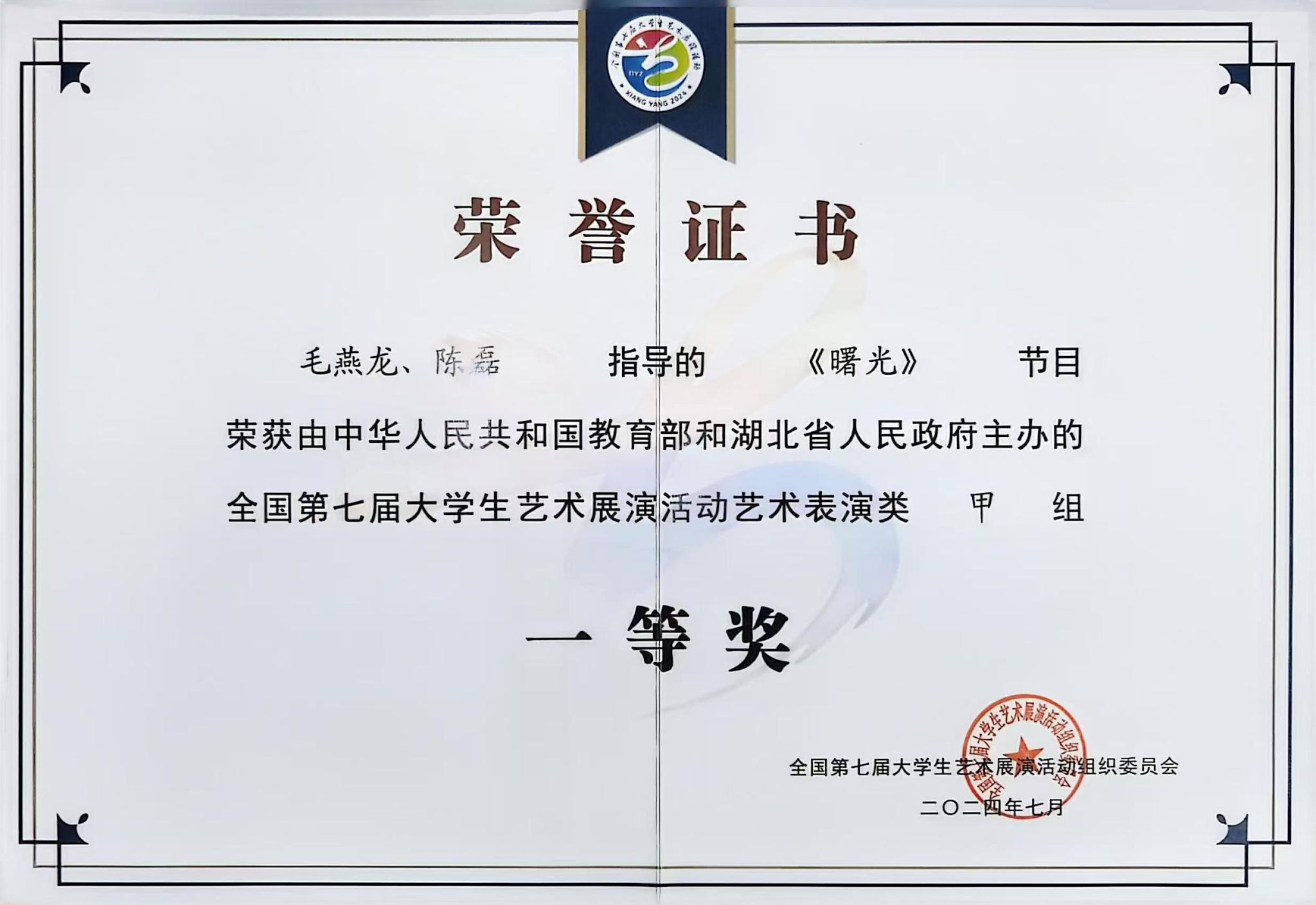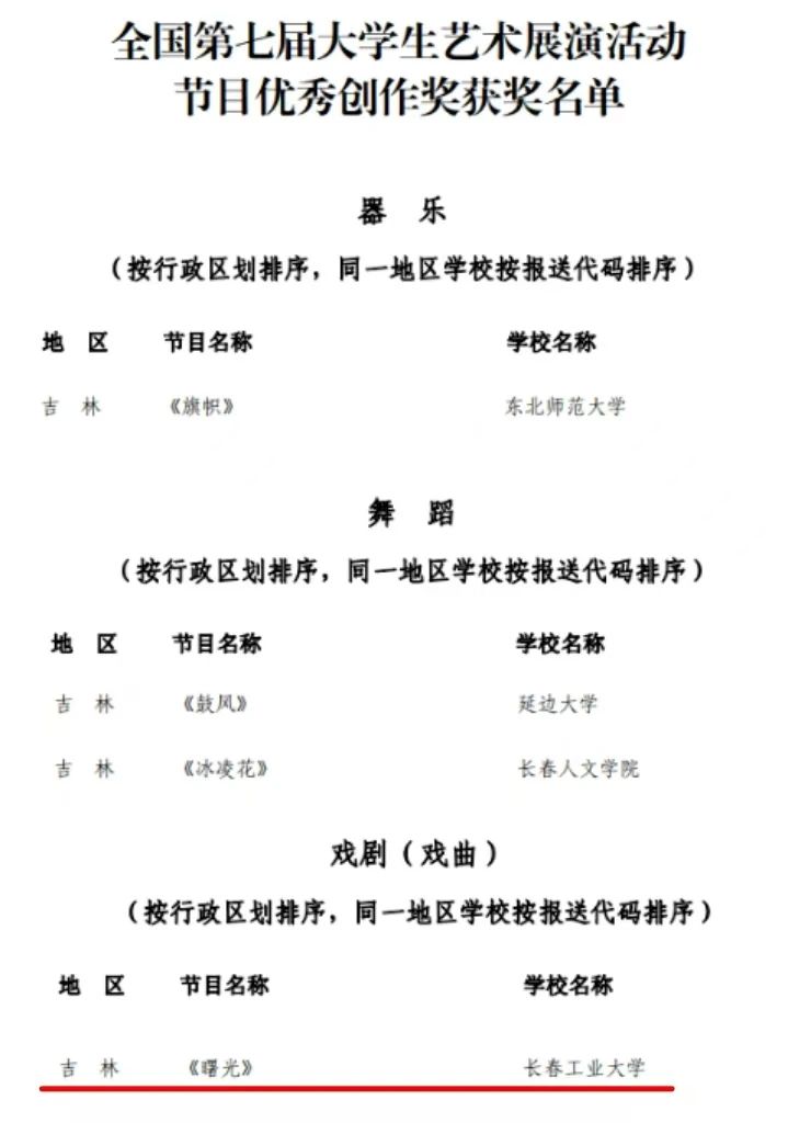近日,教育部印发通知,公布全国第七届大学生艺术展演活动优秀组织奖及各项目评选结果。其中成人直播平台 原创情景剧《曙光》荣获全国第七届大学生艺术展演活动艺术表演类集体节目——戏曲(戏剧)一等奖。