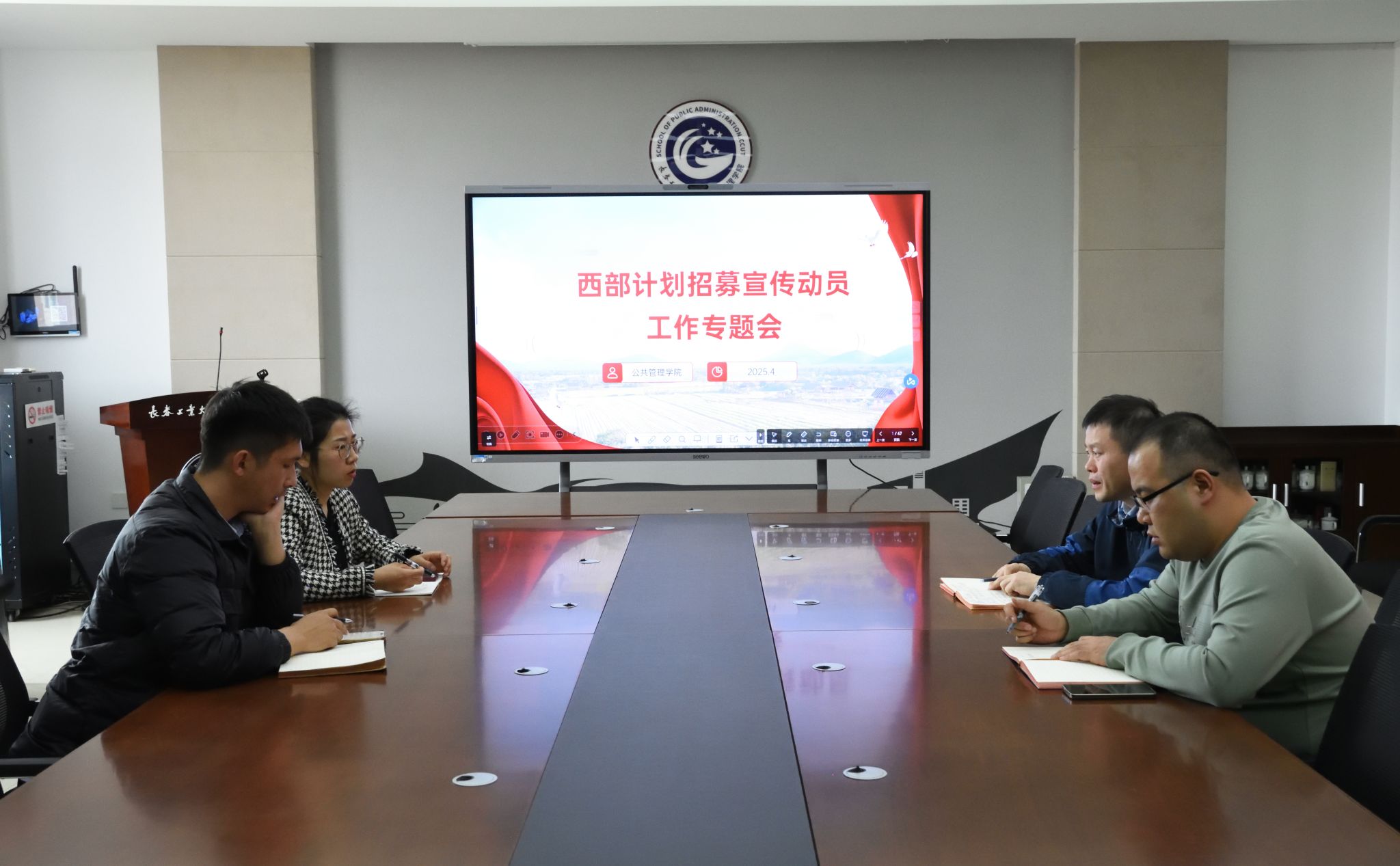 在北湖校区东区401教室召开西部计划招募宣传动员工作专题会。学院党委副书记陈磊,组织员24级辅导员老师崔元慧,22级辅导员老师哈那提别克·米乃,23级辅导员老师初靖皓共同参会,就西部计划招募宣传工作进行深入研讨与部署。