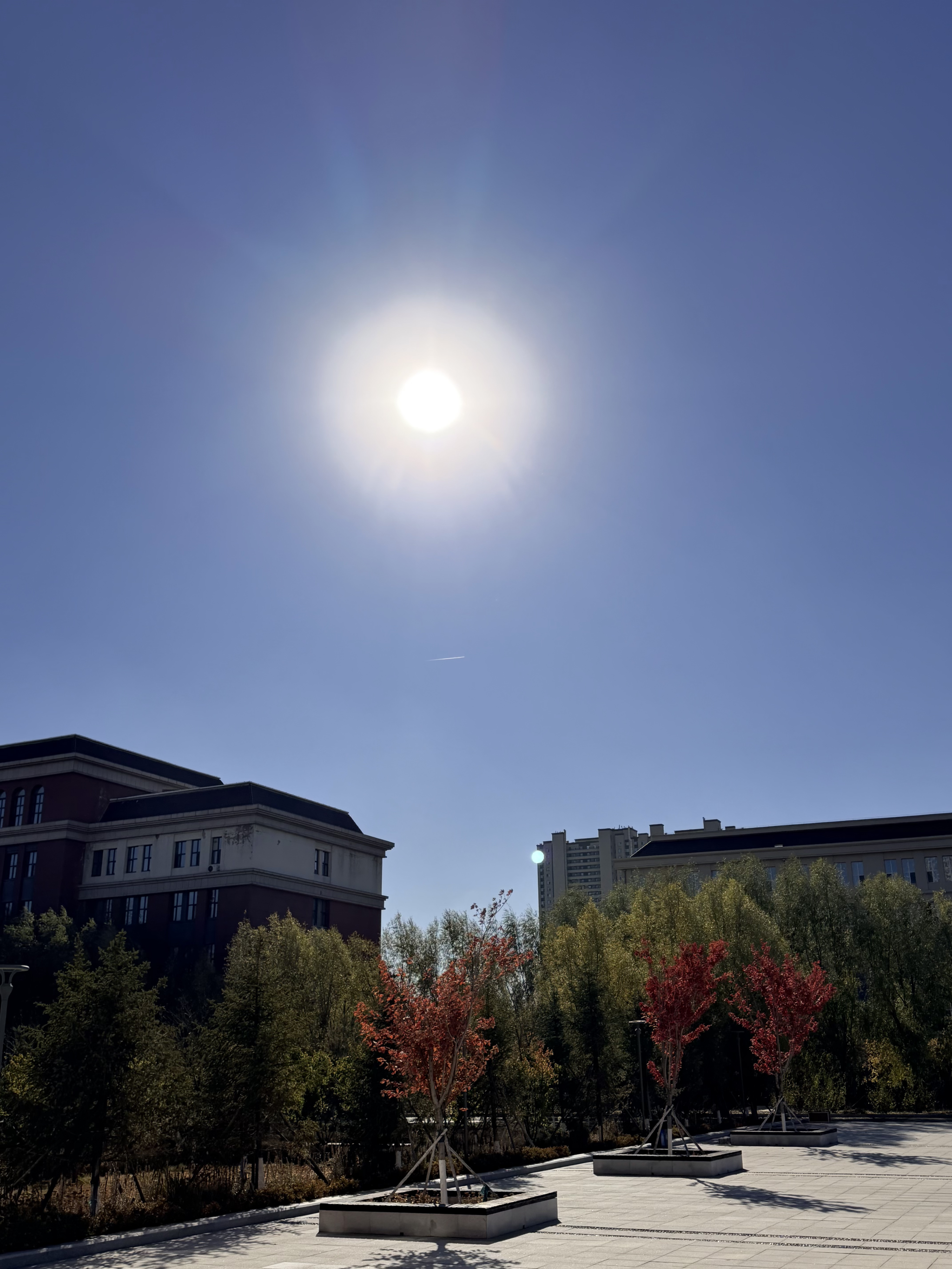 秋日骄阳下,校园建筑与红绿相间的林木相映,每一缕阳光都在诉说秋的明朗与热烈。