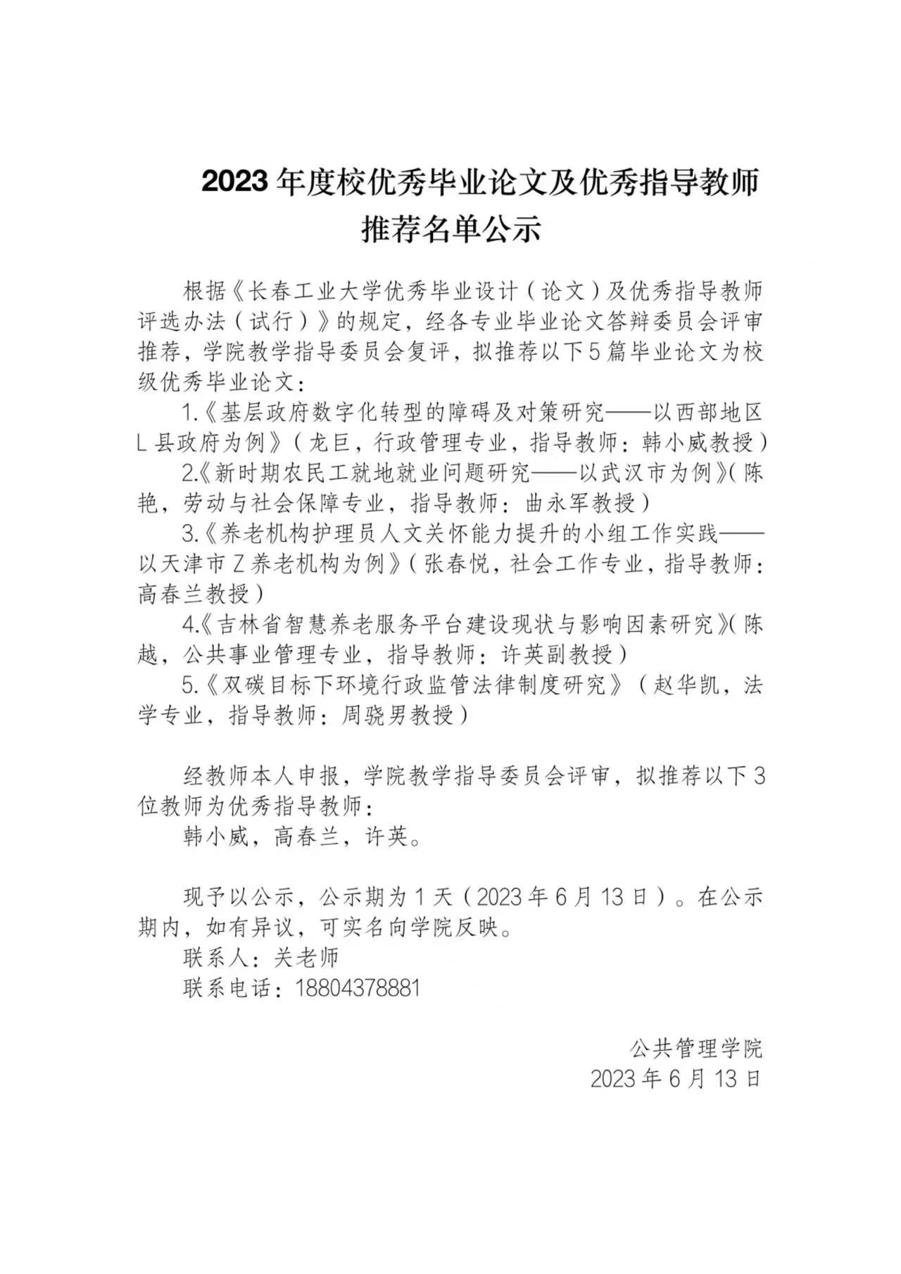 2023年度校优秀毕业论文及优秀指导教师推荐名单公示